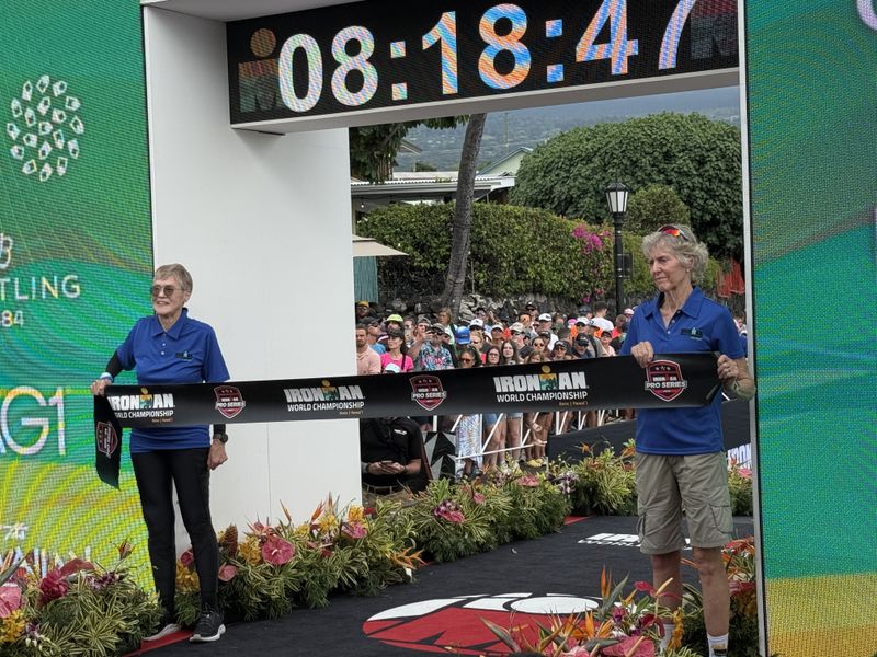 Judy and Cherie holding the finish line tape